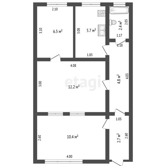 Дом 1969 года постройки. Объект сочетает преимущества городского жилья с комфортом загородного дома. В квартире три комнаты, площадью 12.2/10.4/6.5 кв.м. кухня 5.7 кв.м., совмещенный санузел 2,4 кв.м. и прихожая 7,5 кв.м.